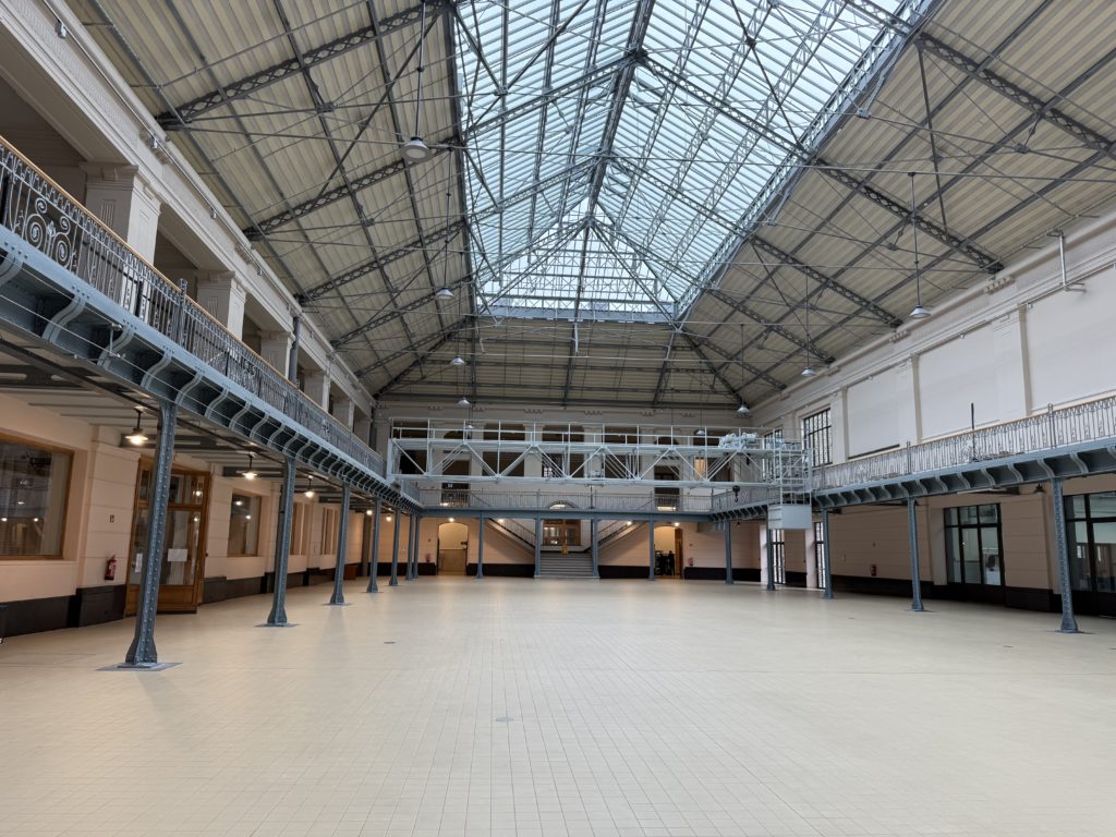 Derrière la façade historique de la HEPH-Condorcet, on découvre ce hall impressionnant, baigné de lumière et digne d’une halle d’exposition. Pourtant, il s’agit bien d’un lieu de formation : les galeries accueillent des espaces de travail pour les étudiantes et étudiants, une salle de classe se niche à l’arrière et un laboratoire dédié aux énergies renouvelables prend place sur la droite. Difficile de ne pas être séduit par un tel environnement d’apprentissage !