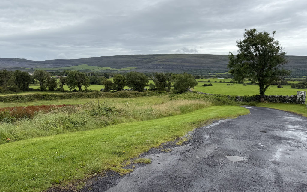 Un paysage typique d’Irlande : entre prairies verdoyantes, murets de pierres sèches et collines rocheuses à l’horizon. Le ciel, quant à lui, reste fidèle à sa réputation…
