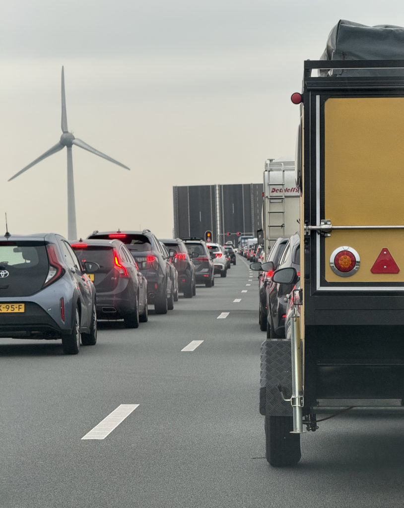 Arrivé aux abords de Leeuwarden, la circulation est interrompue par l’ouverture d’un pont permettant le passage d’un navire, rappelant la relation intime qu’entretiennent les Pays-Bas avec l’eau. À l’arrière-plan, une éolienne souligne l’engagement du pays pour les énergies renouvelables. Ce contraste entre immobilité routière et fluidité fluviale illustre bien la singularité du territoire néerlandais. Ici, même les bateaux ont la priorité sur l’autoroute.
