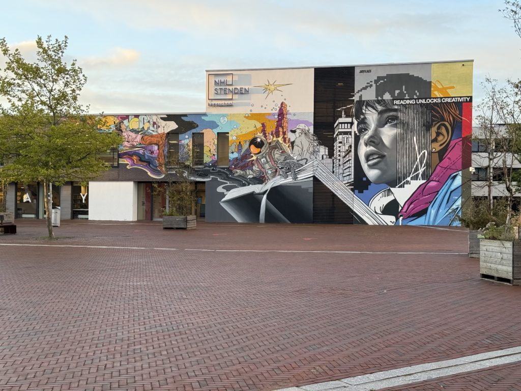 Cette fresque monumentale de l’artiste espagnol Jay Kaes illustre la puissance de la lecture comme déclencheur de créativité et d’imaginaire. Visible sur les murs de NHL Stenden, elle rappelle combien l’art urbain peut nourrir l’apprentissage et inspirer les générations étudiantes. Dans nos formations, lecture, créativité et innovation s’entrelacent pour façonner des parcours d’étude tournés vers l’avenir.