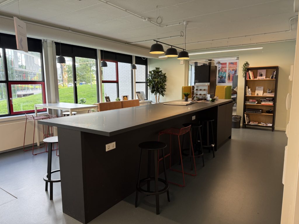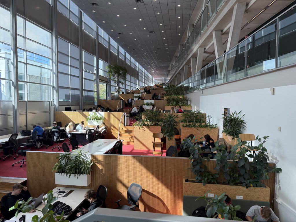 Un vaste espace d’étude lumineux et végétalisé accueille les étudiantes et étudiants de NHL Stenden. Chaque recoin favorise la concentration, la lecture et l’échange. Ce lieu illustre concrètement le lien entre créativité, apprentissage et environnement inspirant, en écho au street art observé sur le campus.