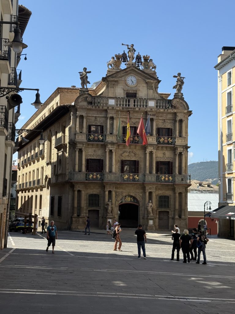 Après une journée dense de rencontres à l’UPNA, place à une découverte du centre historique de Pamplona. L’hôtel de ville, élégant et baroque, trône fièrement sur la célèbre Plaza Consistorial, cœur battant des festivités de San Fermín.