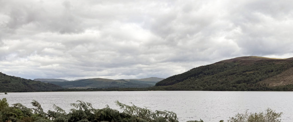 Premiers pas dans les Highlands écossais : entre collines ondoyantes, lac paisible et ciel chargé de promesses météorologiques… on devine déjà que les éclaircies seront aussi fugaces que précieuses.