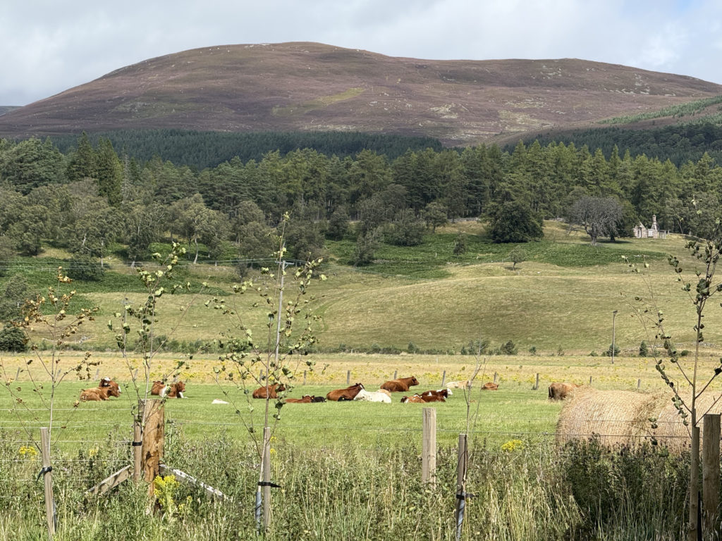 Prairie verdoyante, vaches paisibles, bottes de foin… une scène presque suisse — si ce n’était cette vieille bâtisse de pierre et ce muret typiquement écossais qui rappellent que nous sommes bien dans les Highlands.