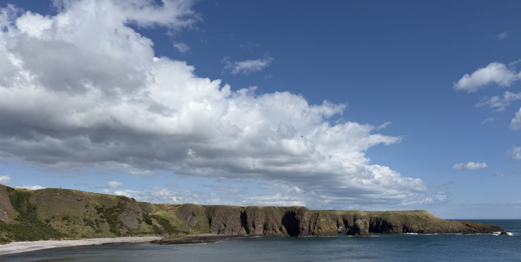 Vue depuis le château de Dunnottar, où les nuages semblent prolonger le tracé accidenté des falaises, dans une harmonie naturelle entre ciel, mer et terre.