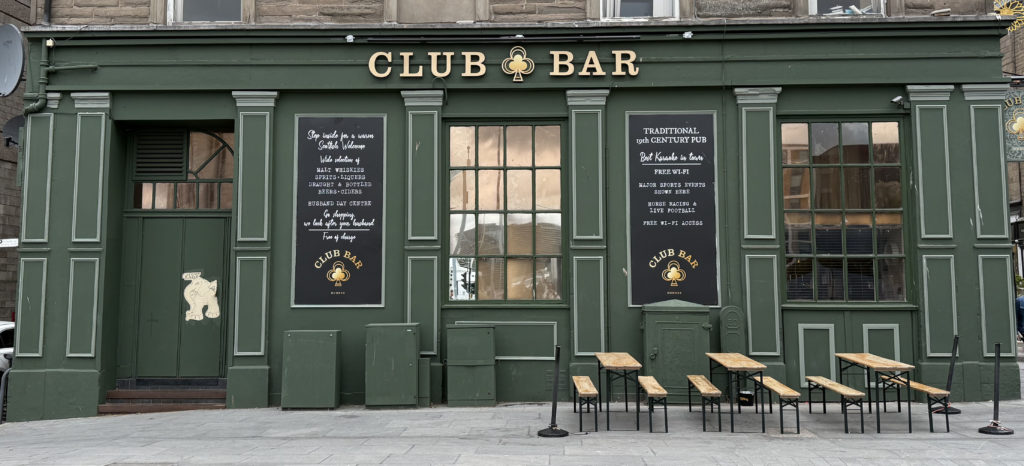 Devanture d’un pub traditionnel à Dundee, dont l’humour britannique s’exprime sur l’enseigne : les épouses peuvent faire leurs courses pendant que leurs maris sont pris en charge gratuitement dans ce « centre de jour ».